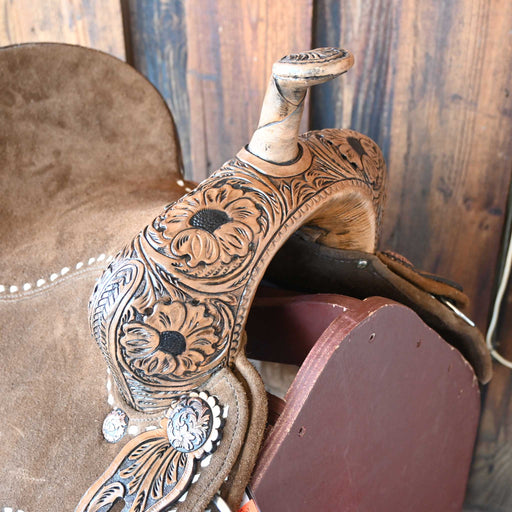 Seven SaddleThis new 13" Seven Lightweight (Wood Tree) Youth Barrel saddle comes in a heavy oil 1/2 floral tooling with a padded seat. For more information cal...