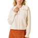 This ivory knit cardigan features a ruffle collar and long sleeves, crafted from soft knit material. It includes a button closure and ribbed detailing at the collar, cuffs, and hem for a refined finish.