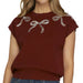 This elegant sleeveless knit sweater features a luxurious blend of 50% viscose, 25% polyester, and 25% nylon for a refined drape and comfortable wear. The wine-hued design showcases delicate sequin bow embellishments across the ribbed knit construction, adding a touch of understated glamour. Perfect for layering or wearing as a standalone piece, this sophisticated sweater elevates any wardrobe with its timeless appeal and intricate detailing.