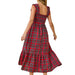 This sleeveless midi dress features a red and green plaid print with delicate ruffle straps and a smocked bodice for a fitted silhouette. Crafted from a comfortable blend of 70% polyester and 30% cotton, it offers both style and ease of wear.
