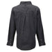 This black chambray shirt features long sleeves with pearl snap buttons down the front and includes two chest pockets. Made from 100% cotton, it offers comfort and durability.